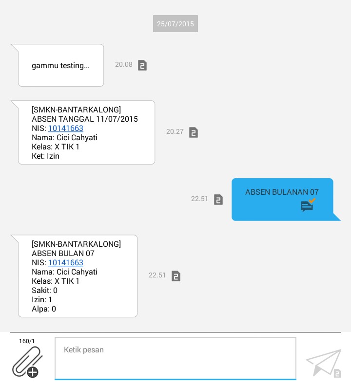 Software ini akan secara otomatis memberitahu kepada Orangtua siswa dan Wali kelas lewat SMS tentang kehadiran siswa pada hari itu atau pada tanggal / bulan tertentu. Bisa juga diakses secara manual dengan format SMS yang telah ditentukan.